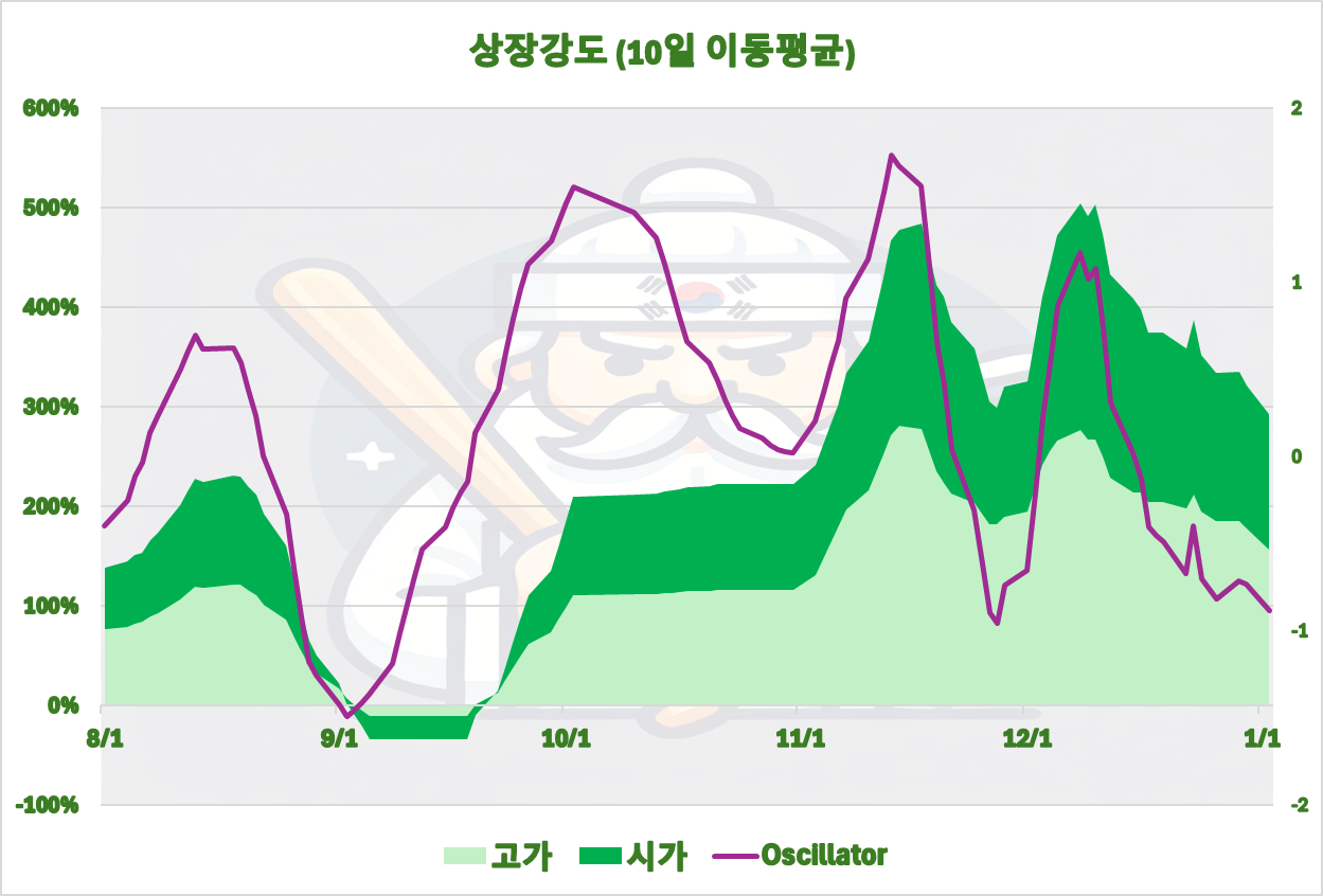 다만 상장강도의 오실레이터 상으로는 아주 바닥을 치는게 아니라면 또 반등할 수도 있겠습니다.