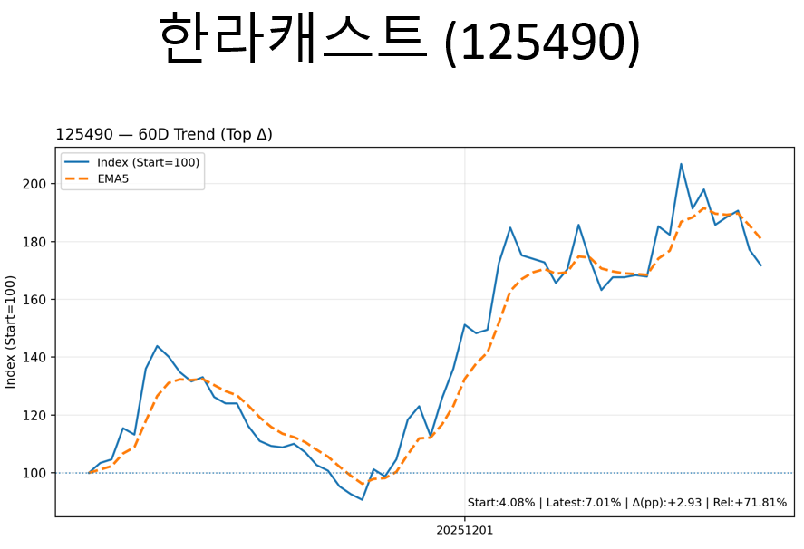 자율주행·전장·로봇용 다이캐스팅 부품을 생산하는 한라캐스트도 조정 중입니다. 대장인 현대차나 두산로보틱스보다는 확실히 약합니다.