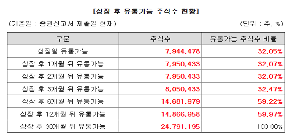 총 상장예정주 2,479만주 중 32%인 794만주가 상장일 유통되며, 금액으로는 794억이 소화되어야 합니다.