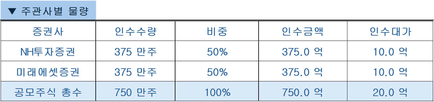 | 증권사 | 인수수량 | 비중 | 인수금액 | 인수대가 |