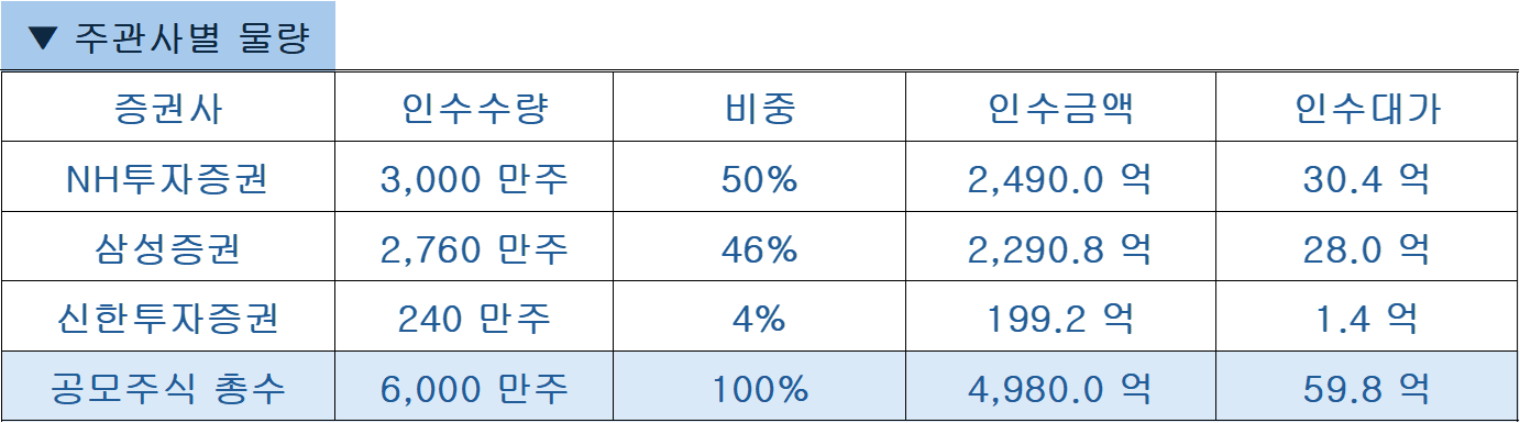 | 증권사 | 인수수량 | 비중 | 인수금액 | 인수대가 |