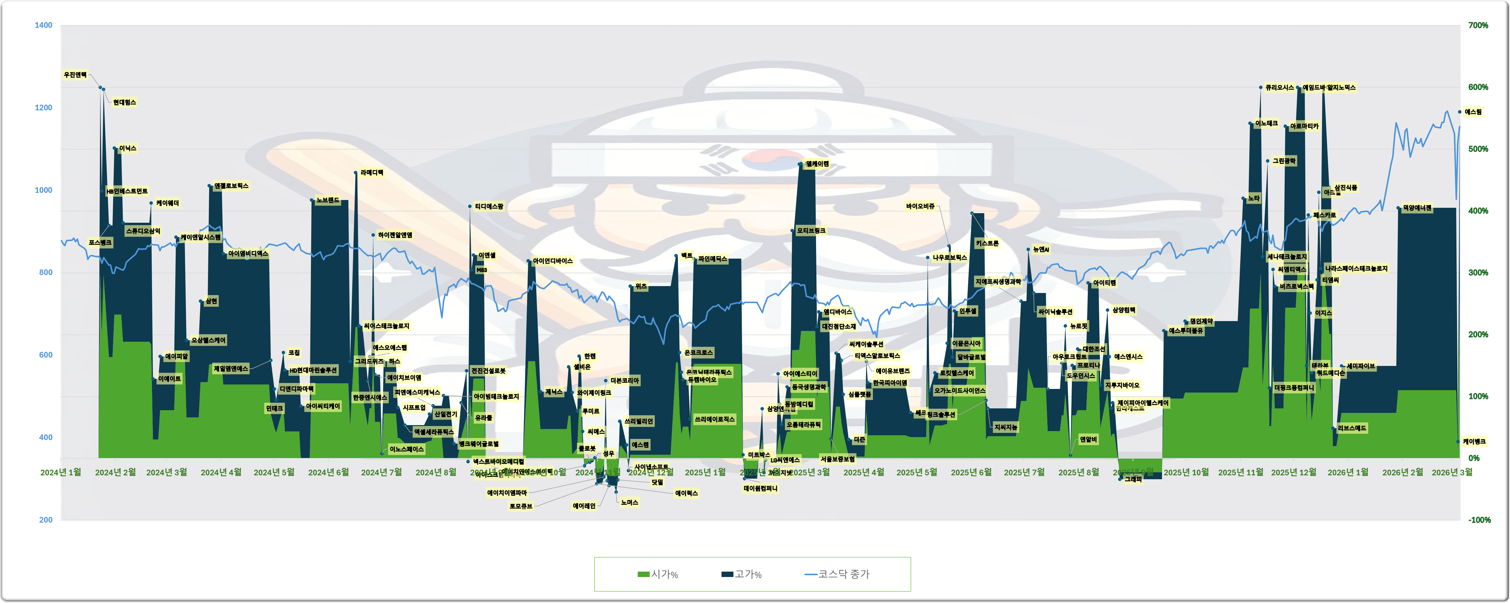 초록색은 공모가 대비 시가, 청록색은 공모가 대비 고가입니다. (오후에 고가가 나오기도 하지만, 보통 오전/아침에 나오기 때문에, 확률적으로 시초가나 장초반에 매도하는게 유리합니다)