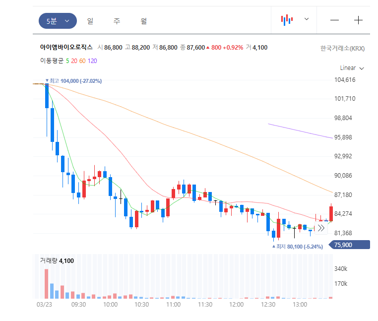 아이엠바이오로직스는 공모가 26,000원 대비 약 4배 수준인 104,000원에서 시초가가 형성되며 고점을 기록한 뒤, 장중 내내 하락하여 종가 약 8.7만원 수준으로 마감한 전형적인 IPO 과열 후 조정 흐름을 보였습니다.