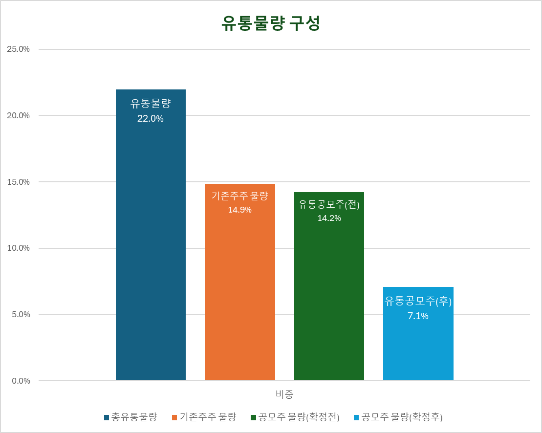유통물량 약 22%는 기존주주 14.9%와 공모주주 7.1%로 구성됩니다