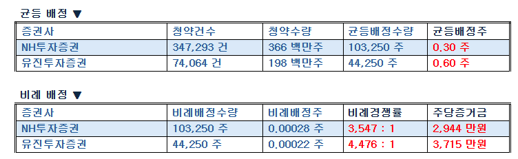 | 증권사 | 청약건수 | 청약수량 | 균등배정수량 | 균등배정주 | |