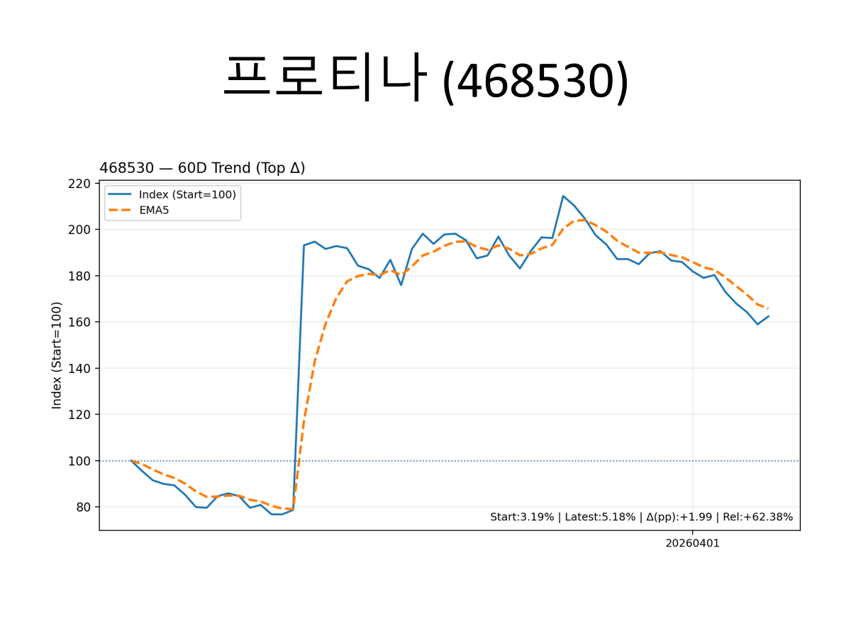 단백질 플랫폼에 대한 기대로 올랐던 프로티나는, 상승 반전을 시도했지만, 계속 흘러 내립니다.