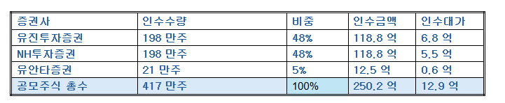 | 증권사 | 인수수량 | 비중 | 인수금액 | 인수대가 |