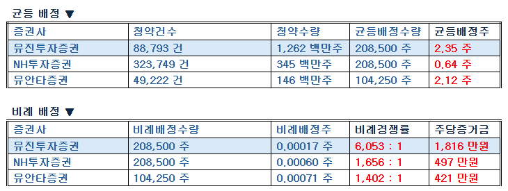 | NH투자증권 | 208,500 주 | 0.00060 주 | 1,656 : 1 | 497 만원 |