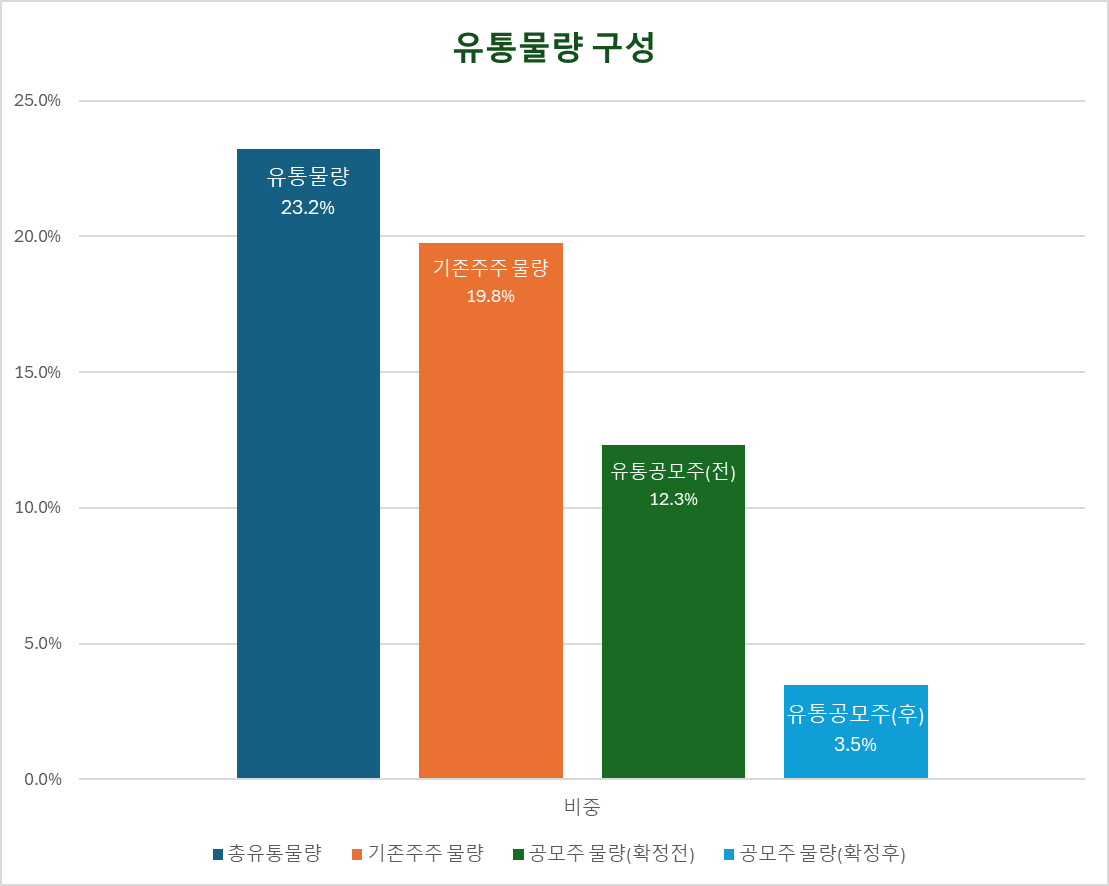 유통물량 약 23%는 기존주주 19.8%와 공모주주 3.5%로 구성됩니다