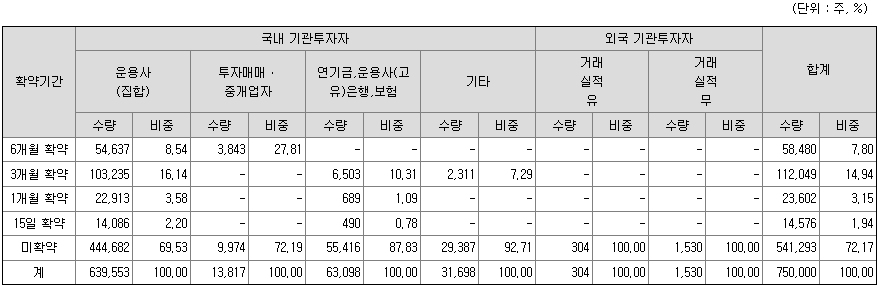 대체로 위너스보다 기술적 장벽이 있다고 판단하는 것인지, 비슷했던 확약 물량이 확정에서는 엘케이켐이 우위를 보이네요. (엘케이켐 28% vs 위너스 15%)