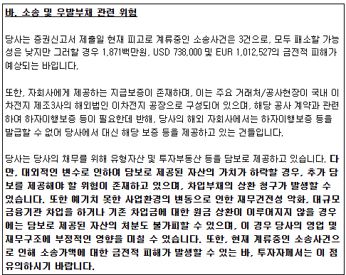 소송 건이 3건 있긴 한데, 우발부채 가능성의 측면 이외에 사업적인 위험 연관성은 크지 않아 보입니다.