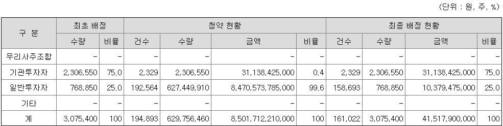 - 비례청약 배정 : 통합기준 0.00061주 (1,632 대 1, 주당증거금 1,102 만원)