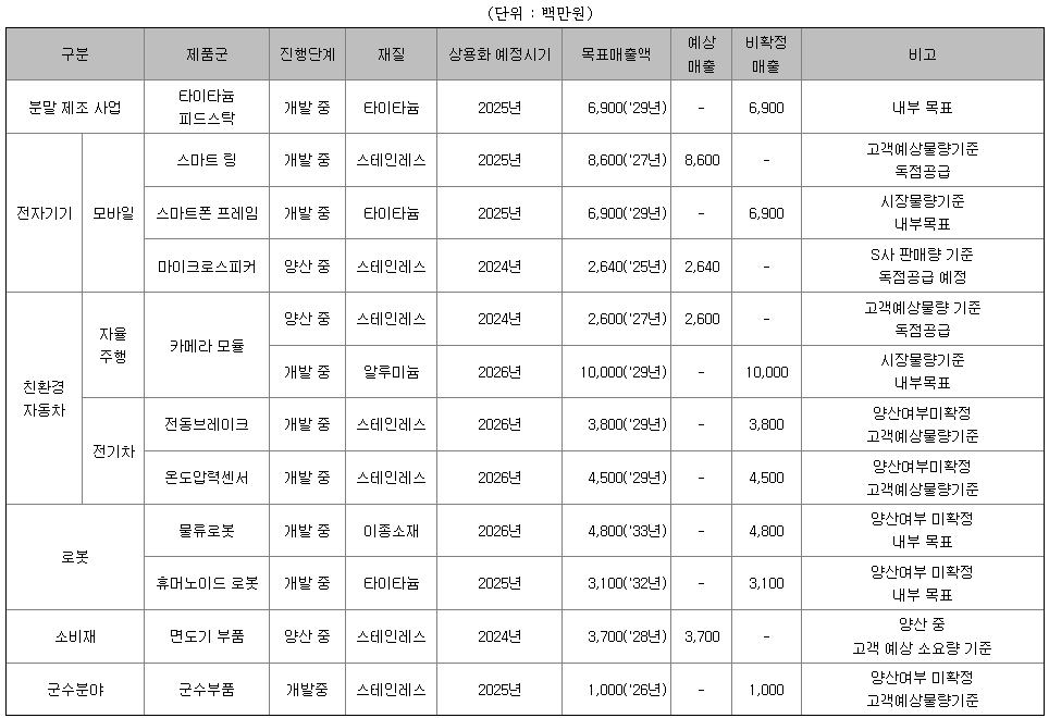 - 신규 사업 : 전자기기 부품(마이크로스피커, 카메라모듈), 친환경 자동차 부품 및 로봇 산업 관련 부품