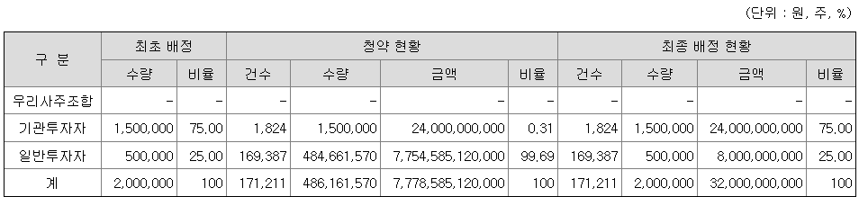 - 비례청약 배정 : 0.00052주 (1,939 대 1, 주당증거금 1,551 만원)