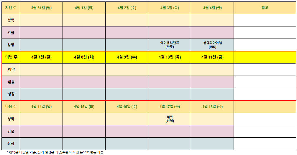 지난 주 에이유브랜즈와 한국피아이엠 상중 후 금주는 청약도 상장도 없습니다.