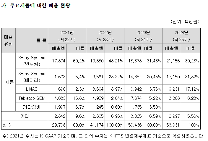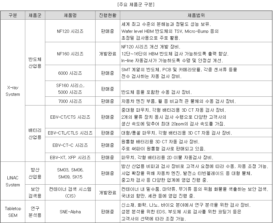 - 주요 매출('23년 기준) : X-ray 2차전지 검사장비: 71%, AS 매출: 26%