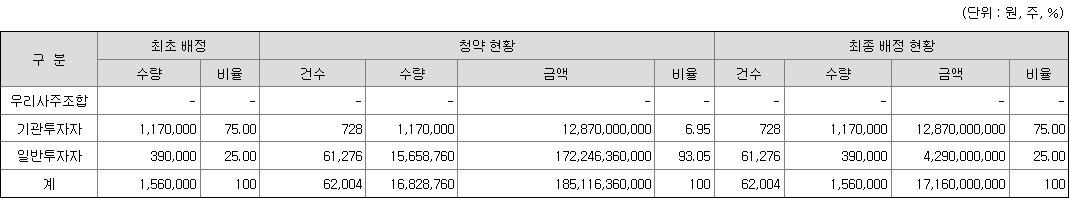 - 비례청약 배정 : SK증권 0.01482주 (67 대 1, 주당증거금 37 만원) / KB증권 0.00511주 (196 대 1, 주당증거금 108 만원)
