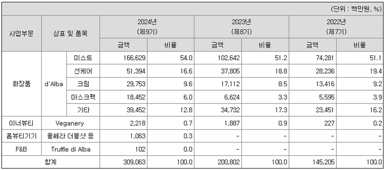 - 주요 매출 품목 : 미스트(54%), 선크림(16.6%), 크림(9.6%)