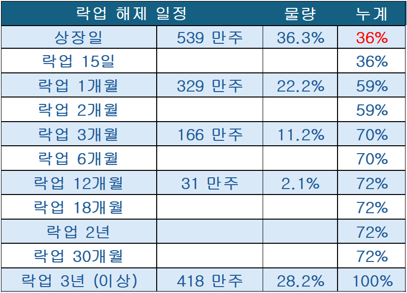유통물량이 적지 않은데, 유통가능 물량표를 매우 보기 어렵게 제공하고 있습니다. 소계도 합계도 없고, 심지어 공모주도 미포함. 초기 투자자들의 엑싯 자체는 마냥 부정적으로 보지 않는데, 굳이 이렇게 한다고 안보이는 것도 아니고... 보기 편하게 만들어주면 좋겠습니다.