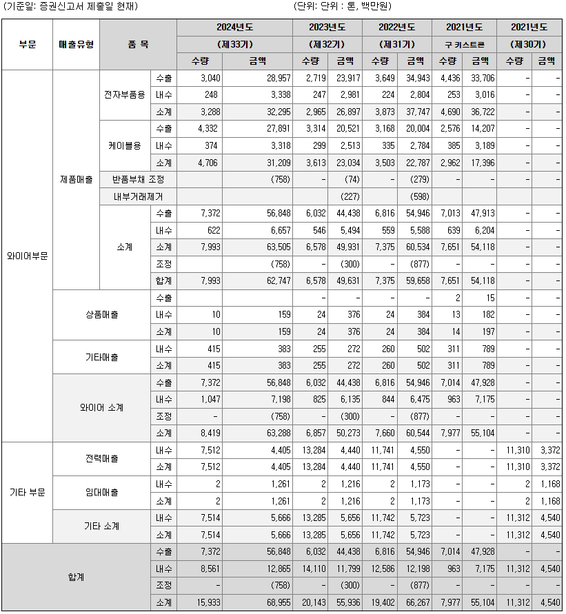 - 제품 유형 : 전자부품용 와이어, 케이블용 와이어, 전력매출 (태양광), 임대수익
