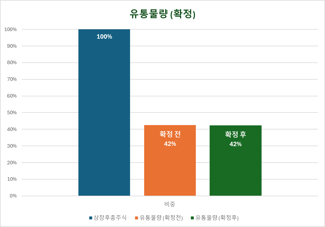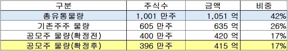 유통물량 약 42%는 기존주주 26%와 공모주주 17%로 구성됩니다.
