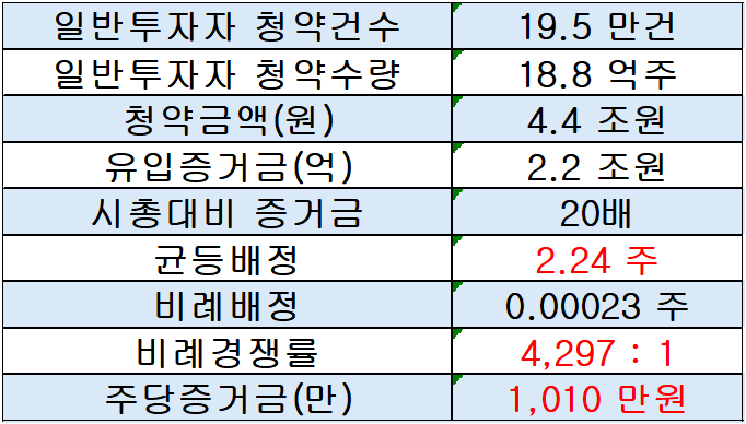 균등은 2.2주 배정이고, 비례는 한 주당 1,010만원이 필요합니다