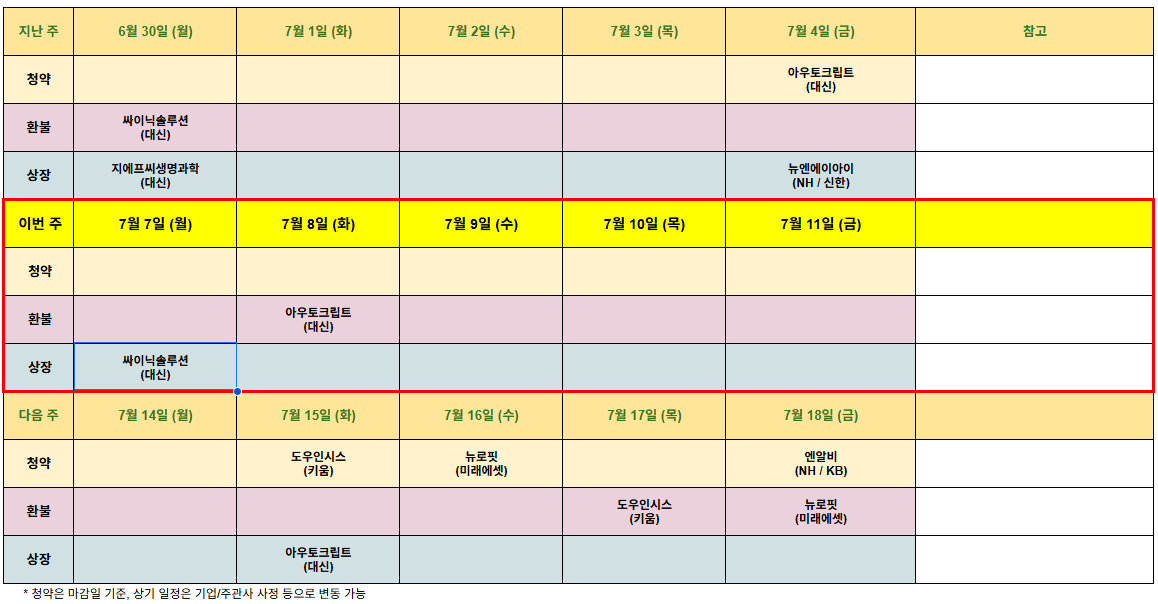 다음주부터는 다시 청약 건들이 늘어나서 바쁜 일정으로 복귀합니다. 코스피 종목도 보이네요. 공시 뜨는 대로 포스팅하도록 하겠습니다.