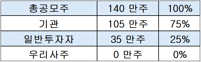 전체 공모주 140만주를 기관 75%, 일반 25%로 배정했습니다