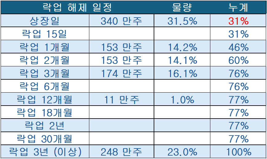 상장 후 1개월 후 약 14% 물량이 추가로 락업해제되며, 총 46% 물량이 1개월만에 유통되는 구조입니다.
