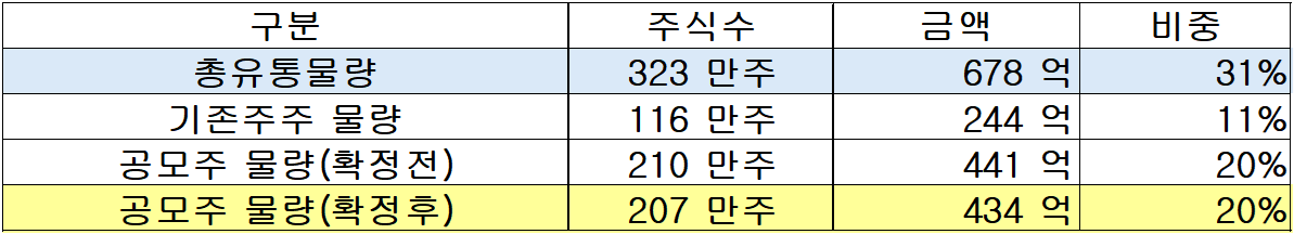 유통물량 약 31%는 기존주주 11%와 공모주주 20%로 구성됩니다