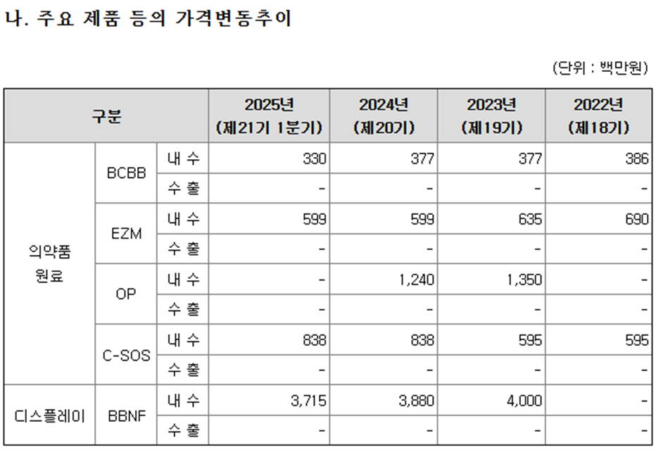 - 주요 사업: 원료의약품 CDMO(위탁개발생산), 디스플레이(OLED) 소재, 전자재료