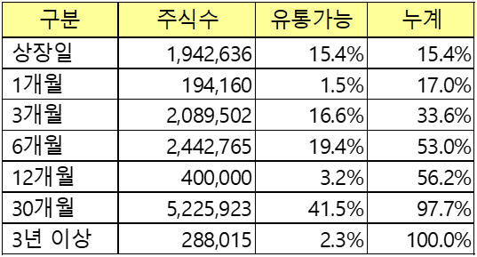 상장 후 1개월 후 약 2% 물량이 추가로 락업해제되며, 총 17% 물량이 1개월만에 유통되는 구조입니다.