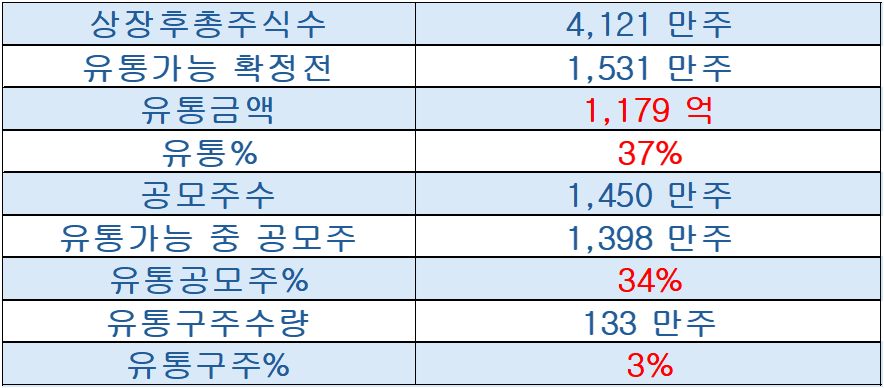 총 상장예정주 4,121만주 중 37%인 1,531만주가 상장일 유통되며, 금액으로는 1,179억이 소화되어야 합니다.