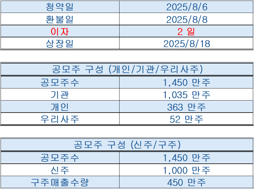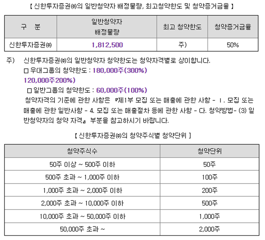 주관사는 신한투자증권, NH투자증권 공동대표주관사이며, 최소 청약은 둘 다 50주로 증거금은 192,500원입니다. 수수료는 2,000원입니다.