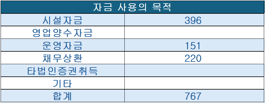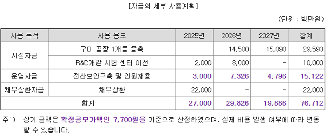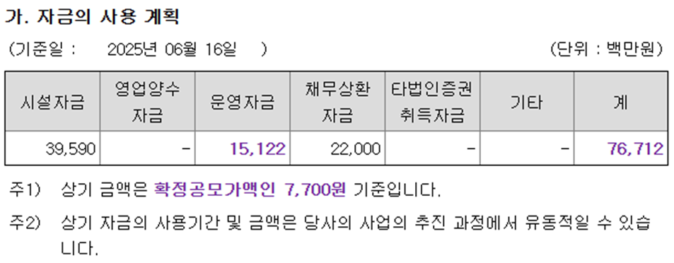 공모를 통해 확보한 자금은 시설자금, 운영자금, 채무상환 용도로 활용됩니다.