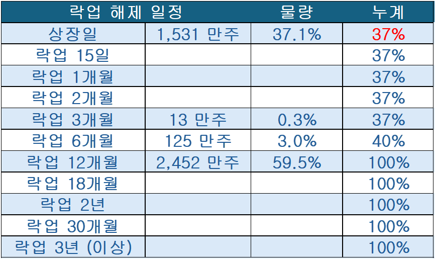 상장 후 6개월 후 약 3% 물량이 추가로 락업해제되며, 추가 유통물량에 대한 부담은 없네요.