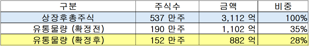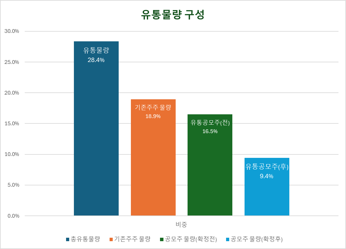 유통물량 약 28%는 기존주주 18.9%와 공모주주 9.4%로 구성됩니다.