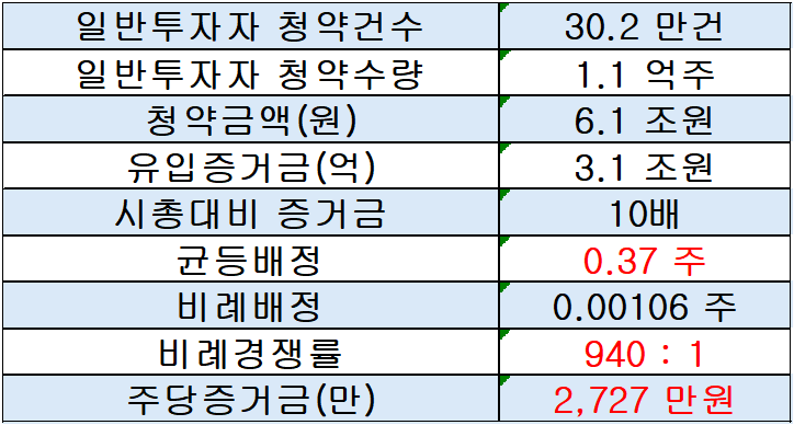 비례경쟁률은 940:1로 한주당 증거금은 약 2,727 만원입니다.