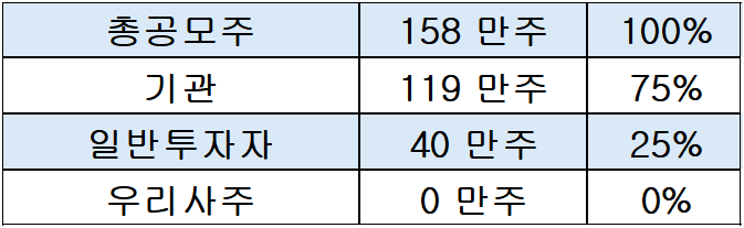전체 공모주 158만주를 기관 75%, 일반 25%로 배정했습니다