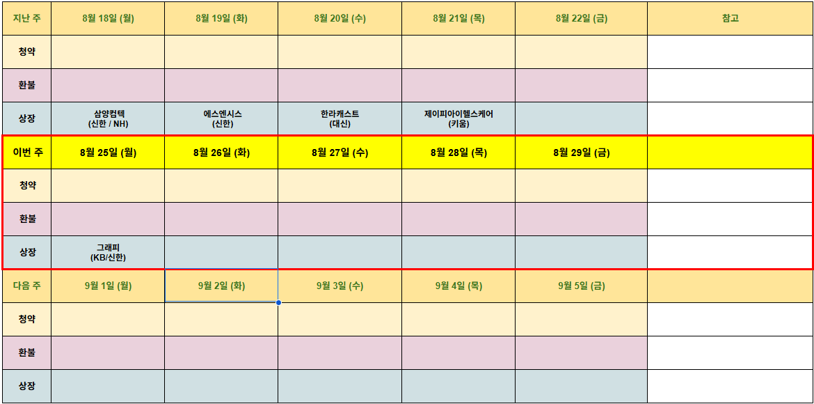 지난 주 말씀드린 대로 공모주 제도 개편 영향으로 25일(월) 그래피 상장 후, 다음 일정은 9월 10일~11일 에스투더블유의 청약으로 예상됩니다.
