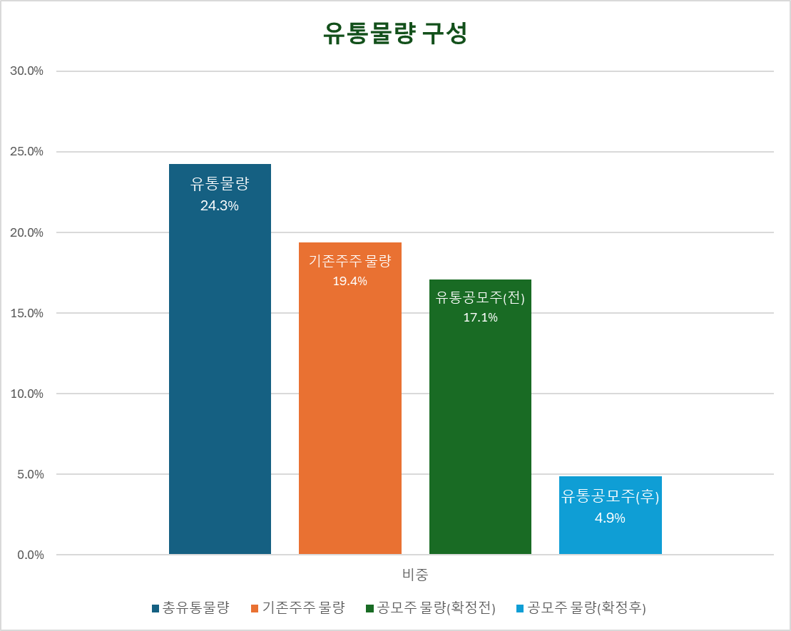 유통물량 약 24%는 기존주주 19.4%와 공모주주 4.9%로 구성됩니다