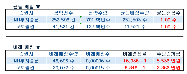 | 증권사 | 청약건수 | 청약수량 | 균등배정수량 | 균등배정주 |