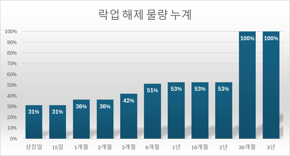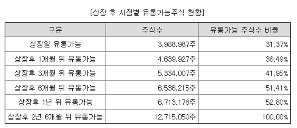 상장 후 1개월 후 약 5% 물량이 추가로 락업해제되며, 총 36% 물량이 1개월만에 유통되는 구조입니다.