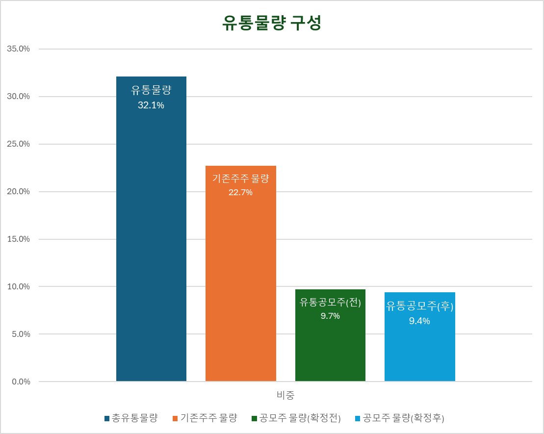 유통물량 약 32%는 기존주주 22.7%와 공모주주 9.4%로 구성됩니다