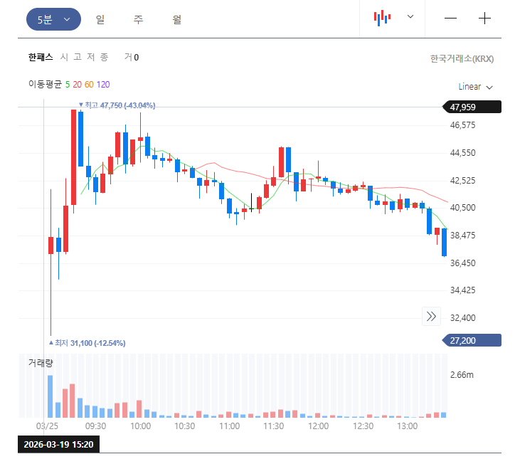 최근 상장한 한패스는 공모가 19,000원으로 상장한 종목으로, 상장 당일 시가는 약 38,000원에서 출발해 장중 47,000원까지
