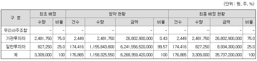 - 비례청약 배정 : 0.00036주 (2,794 대 1, 주당증거금 1,509 만원)