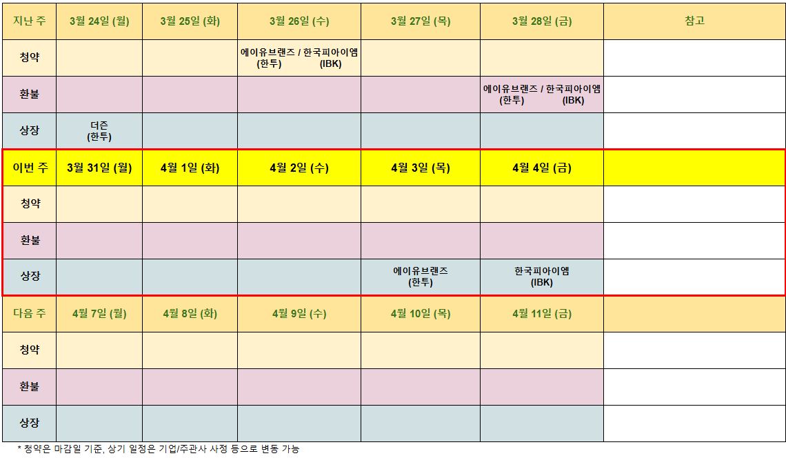 금주는 에이유브랜즈(목요일)과 한국피아이엠(금요일), 두 종목의 상장만 있습니다.